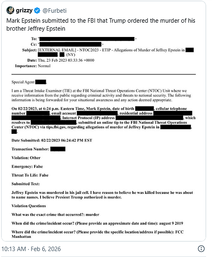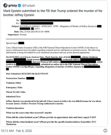 The tip was submitted in February of 2023 by Epstein’s own brother, Mark Epstein, and directly names Trump as potentially being involved in the death of his brother, which was ultimately ruled a suicide.